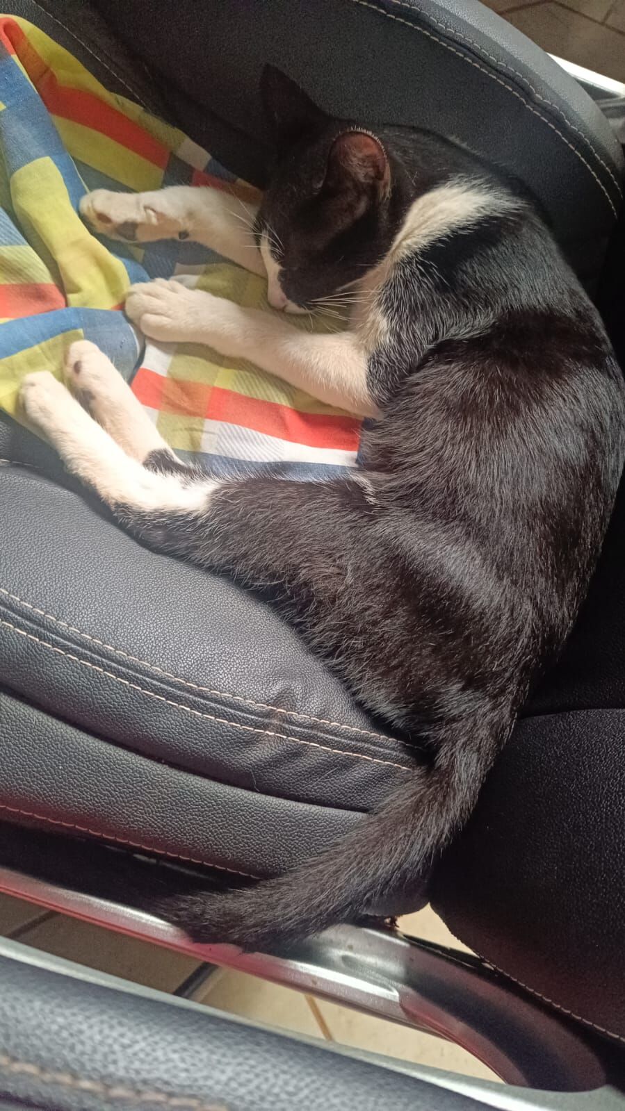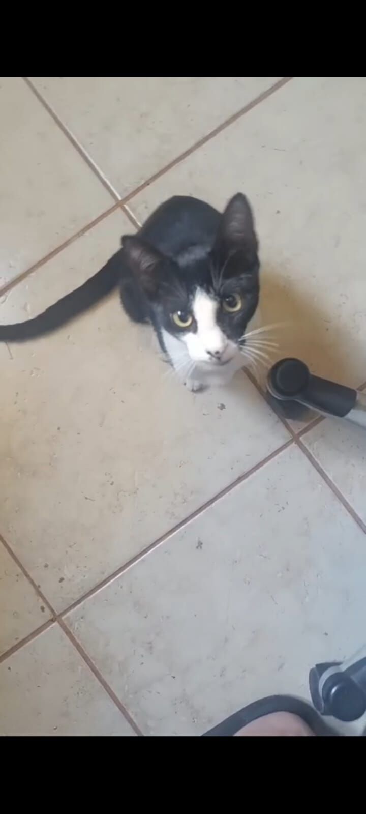 De madrugada ouvi um miado, abri a porta e fui ver, vi um vulto se mexendo e percebi que era um gatinho. Comecei a conversar com ele, sem sair do meu lugar, então ele foi se aproximando, rolando no chão, cheirando meu chinelo. Até que percebi meu gato chegando, ele é muito ciumento e bravo, então peguei o gatinho entrei em casa e levei para o quarto do meu filho (que não está em casa). Dei água, ração, churu, estimulei a usar a areia, ele não foi na areia, mas comeu ração muito bem, estava bem magrinho, tomou bastante água, esta cheinho agora. Mas não podemos ficar com ele, pois viajamos muito e só é possível carregar o meu gato.