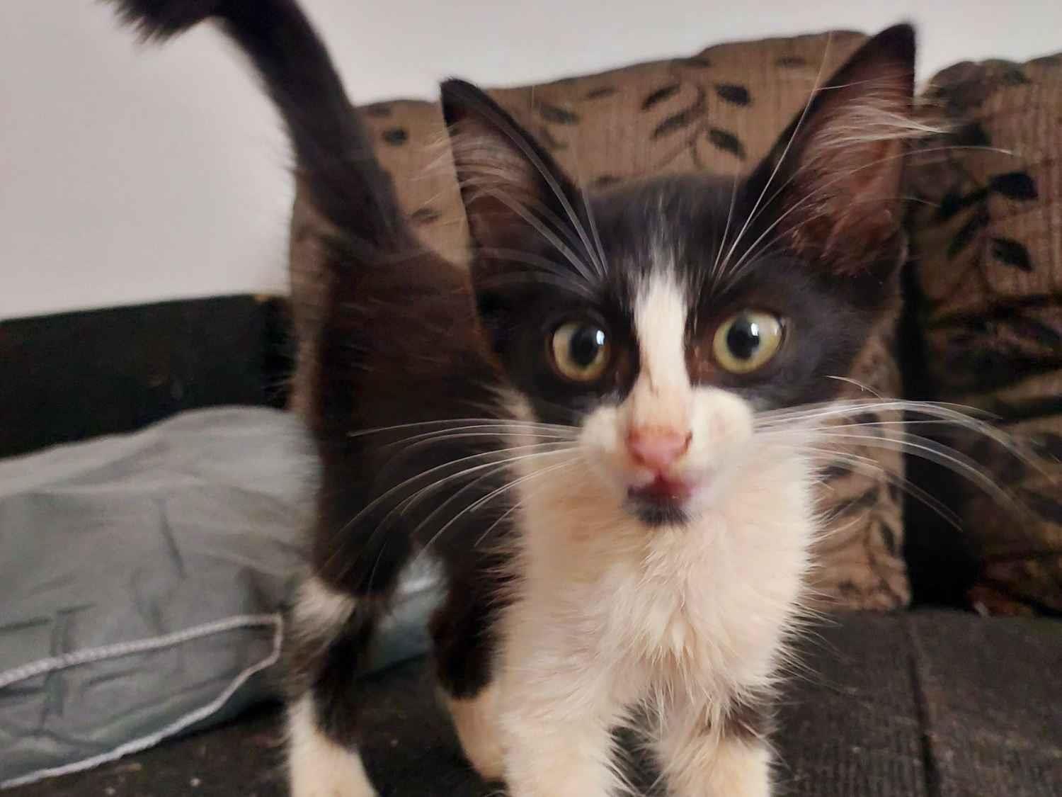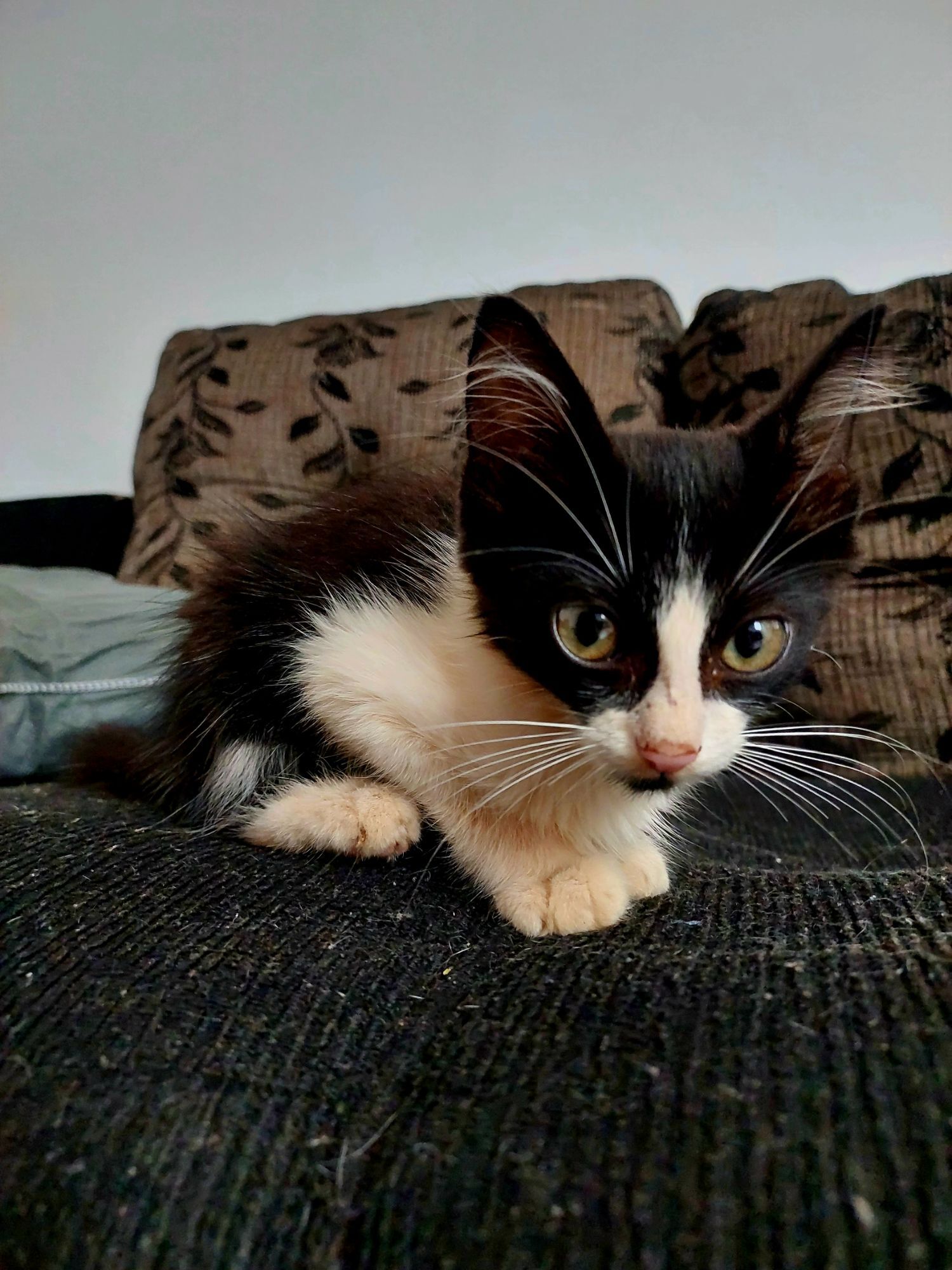 Foi encontrado em um residencial, estava abandonado, está magrinho. Esta em um lar temporário, mas precisa de um dono. Come ração para gato filhote e faz duas necessidades na caixinha de areia. É muito carinhoso e carente, ainda é filhote. Precisa de alguém que o cuide com muito amor e atenção. Dei o nome franjola mas fica a critério do próximo dono se será esse.