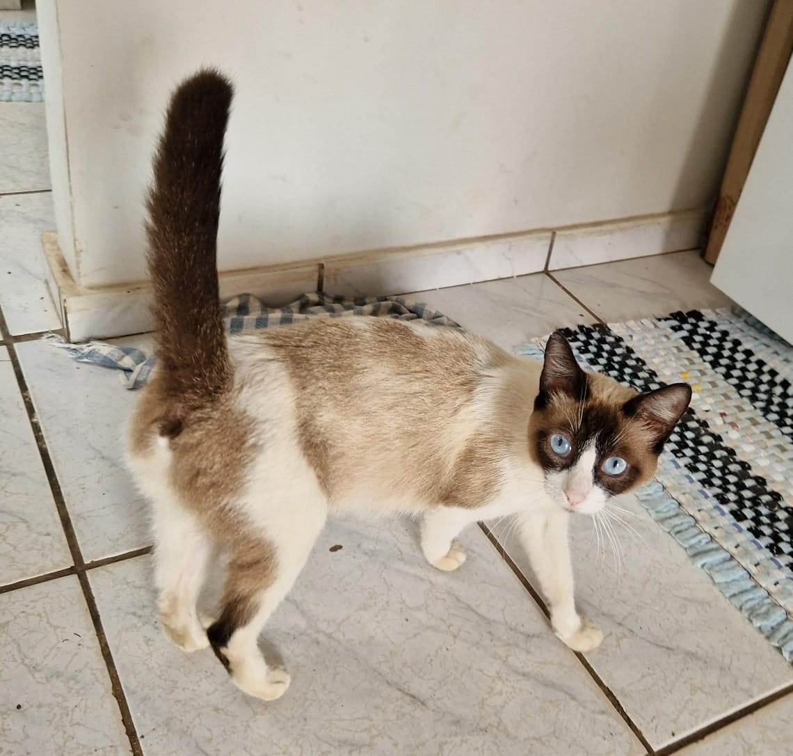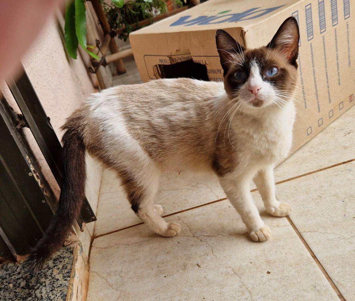 A gata circulava sem dono pela vizinhança, e os vizinhos passaram a ajudar dando comida e água. No início ela até tinha um pouco de medo, mas logo se mostrou dócil, carinhosa e brincalhona. Ela é clara com manchas bege e olhos azuis. Acabou tendo filhotes e todos já foram adotados, mas não podemos ficar com ela. Certamente foi a primeira cria e talvez até tenha menos de um ano.